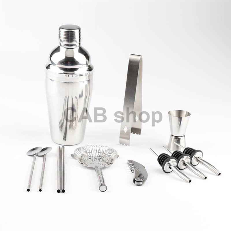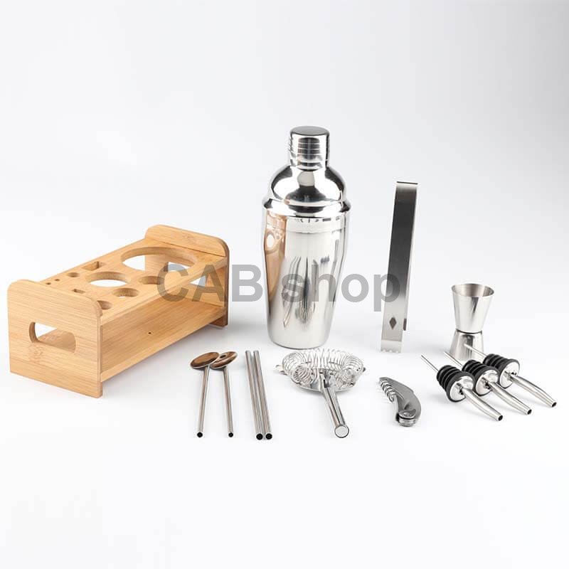 Kompletný set pre každého barmana: Barmanský set obsahuje 13 esenciálnych nástrojov vrátane šejkra Cobblera (750 ml), klieští na ľad, filtra "sitka", drtiča "muddler", dlhej barovej lyžice, vývrtky, otvárača na fľaše, troch nalievaciek, obojstrannej odmerky (15 ml / 30 ml - "jigger") a nerezového stojana. Tento komplexný set je ideálny pre začiatočníkov aj profesionálov.