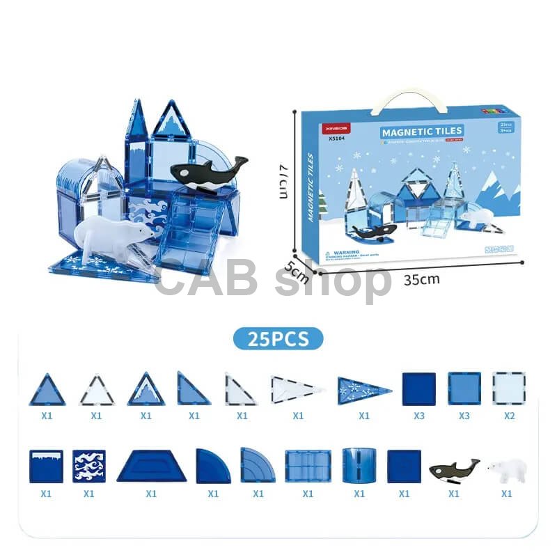 - 25 magnetických dlaždíc rôznych tvarov a farieb (v základnej sade)